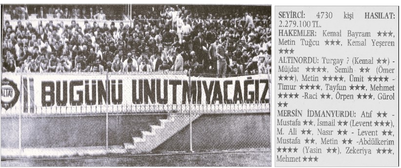 İzmir dışında üniversite tahsilimi yapıyordum. Maçlara gelemediğim yıllardı ama takip ediyordum. Altay yenilgisinden sonra şampiyonluk şansımız zayıflamıştı. Artık bu yarışta Altay ve Mersin İ.Y.’nun baş başa kalacağı anlaşılmıştı. Vize sınavlarından sonra İzmir’e tatile gelmiştim ve soluğu A.Ordu – Mersin İ.Y.maçında alıyordum.